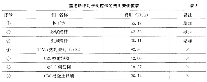 见表3。其中,挖石方费用增加了55.17万元,砂浆锚杆费用减少了42.53万元,φ42锁脚锚杆费用增加了25.11万元。