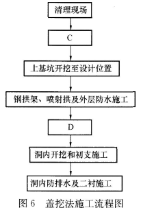 事件1:隧道施工开工前,施工单位向监理单位提供了施工安全风险评估报告。在YK52+875~YK52+845段明洞开挖施工过程中,临时边坡发生了滑塌。经有关单位现场研究,决定将后续YK52+845~YK52+740段设计方案调整为盖挖法,YK52+785的盖挖法横断面设计示意图如图5所示,盖挖法施工流程图如图6所示。
