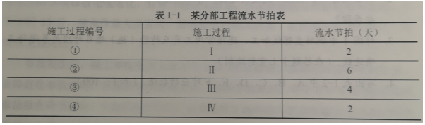 复工前,项目部盘点工作内容,结合该住宅楼3个单元相同的特点,依据原有施工进度计划,按照分析检查结果、确定调整对象等调整步骤,调整施工进度。同时,针对某分部工程制定流水节拍(如表1-1),就施工过程1~IV组织4个施工班组流水施工,其中施工过程Ⅲ因工艺要求需待施工过程II完成后2天方可进行。