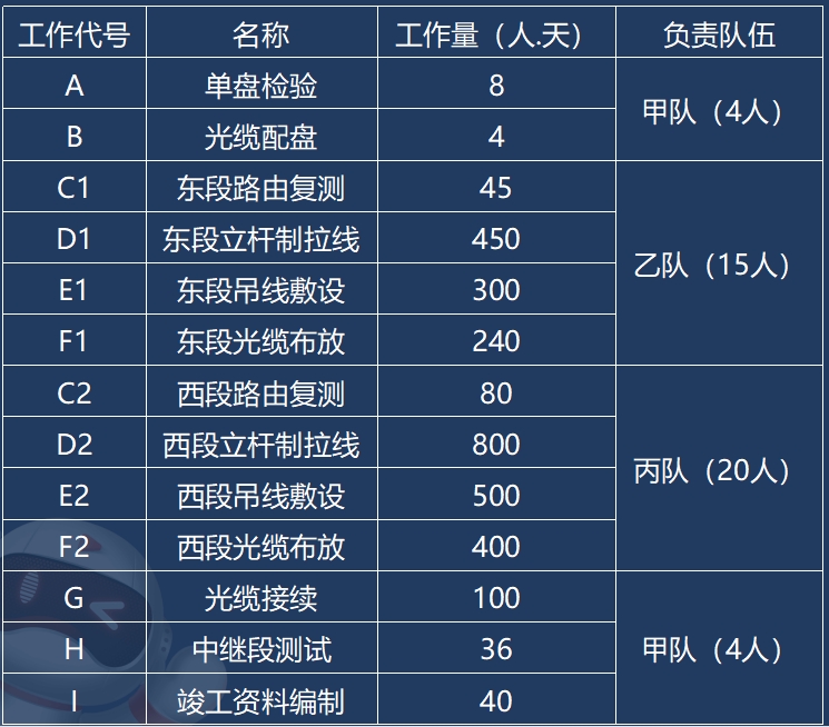(1)配盘B工作分为东段配盘B1和西段配盘B2,分别由乙丙两队队长晚上加班完成。B1和B2的工作量均为2人.天,晚上加班完成白天工作量的一半。