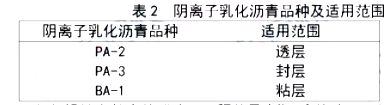 事件二:经过集料试验,该工程材料的集料属于碱性集料,施工单位决定采用阴离子乳化沥青。项目部共购买了PA-2、PA-3、BA-1三个品种的阴离子乳化沥青,计划分别用于透层、封层和粘层的施工。阴离子乳化沥青品种及适用范围见表2。