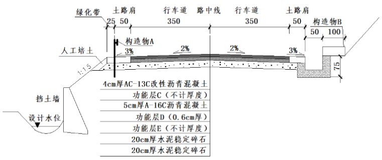 某施工单位承建了一段三级公路工程,包括路基与路面工程,起讫桩号,K0+000~K20+400。该公路左侧临河,临河段设置了路堤挡土墙。为保障行车安全,临河土路肩上设置了构造物A。公路右侧傍山,挖方边坡地质条件为易风化碎落的岩石,在坡脚处设置了100cm宽的构造物B。路基两侧的土路肩采用C20混凝土预制块进行加固。路基断面及路面结构示意图如图2所示。