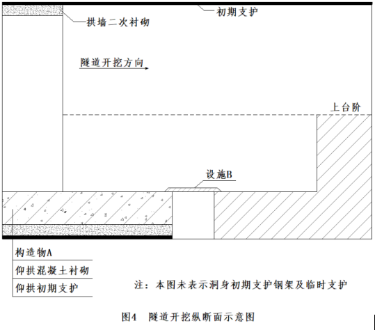 某二级公路单洞双车道隧道,起讫桩号K5+300~K6+220,全长920m,隧道纵坡为1.5%。K5+300~K5+325、K6+200~K6+220段为V级岩:其系段落均为IⅣ级围岩,隧道内涌水量较少,涌突水可能性小,施工单位从隧道两端对向开挖,V级围岩段采用中隔壁法:Ⅳ级围岩段采用二台阶法,上台阶长度8m。隧道一端开挖至桩号K5+600时,其隧道开挖纵断面示意图如图4所示。