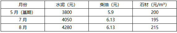 该工程施工期间,原材料价格波动很大,施工合同中约定只对水泥、柴油及石材采用调值公式法进行价差调整。基期为当年5月,工程款按月计量,每月调整价差。该工程投标函投标总报价中,水泥占35%,柴油占15%,石材占20%,各月价格见下表。