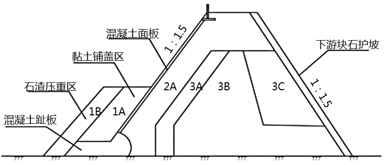 混凝土面板堆石坝最大坝高68m,大坝上下游坡度比1:1.5,大坝材料分区包括:石渣压重(1B)区,黏土覆盖(1A)区,混凝土趾板。混凝土面板及下游块石护坡等。混凝土面板堆石坝材料分区示意图见图1。