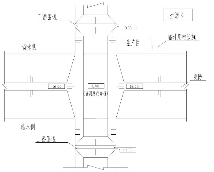 某施工单位承担新庄穿堤涵洞拆除重建工程施工,该涵洞建筑物级别为2级,工程建设内容包括:拆除老涵洞、重建新涵洞等。老涵洞采用凿除法拆除;基坑采用挖明沟和集水井方式进行排水。施工平面布置示意图如图3所示。