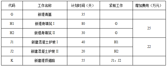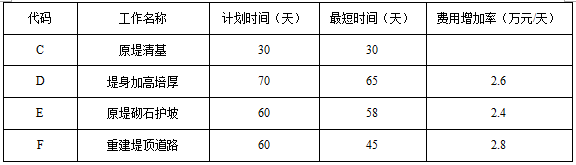 (1)原堤防加固,按增加费用最小原则进行工期优化,相应的工期优化,费用关系见下表: