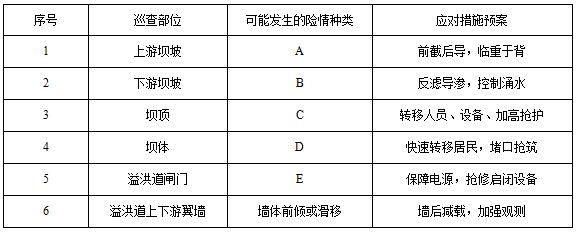 事件三:2018年汛前,该合同工程基本完工,由于当年汛期水库防汛形势险峻,为确保水库安全度汛,根据度汛方案,建设单位组织参建单位对土坝和溢洪道进行险情巡查并制定了土坝和溢洪道工程险情巡查及应对措施预案,部分内容如表5所示。