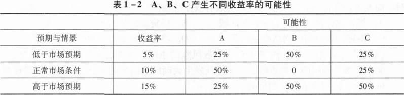 16、商业银行计划推出A、B、C三种不同金融产品。预期在不同市场条件下,三种产品可能产生的收益率分别为5%、10%、15%,产生不同收益率的可能性如表1—2所示。