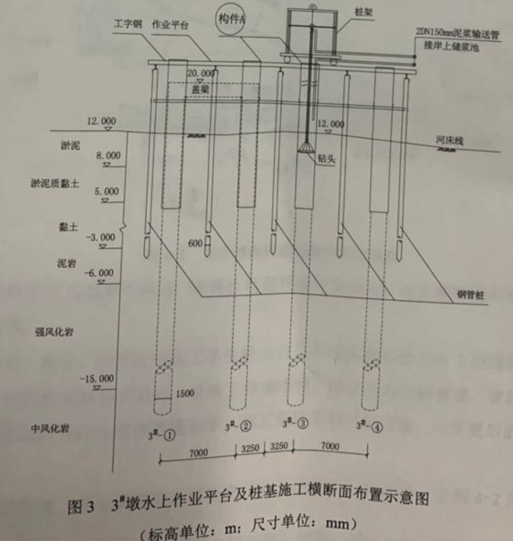 (1)下部结构施工采用水上作业平台施工方案,水上作业平台结构为φ600mm钢管桩+型钢+人字钢板搭设,水上作业平台如图3所示;