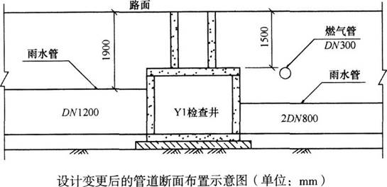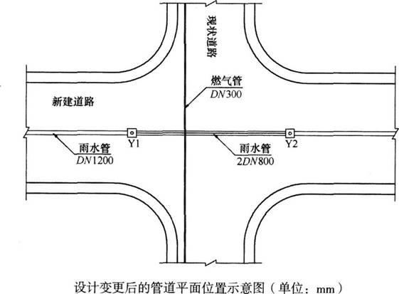 施工前,项目部踏勘现场时,发现雨水管道上部外侧管壁与现况燃气管道底间距小于规范要求,并向建设单位提出变更设计的建议。经设计单位核实,同意将道路交叉口处的Y1~Y2井段的雨水管道变更为双排DN800mm双壁波纹管,设计变更后的管道平面位置示意图与断面布置示意图如下所示。项目部接到变更后提出了索赔申请,经计算,工程变更需增加造价10万元。