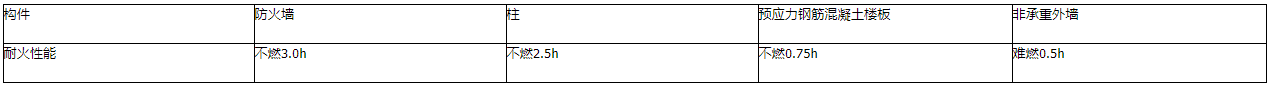 二级耐火等级楼板采用预应力钢筋混凝土楼板耐火等级可为不燃性耐火极限不低于0.75h;除甲乙类仓库和高层仓库外,其他一、二级耐火等级厂房、仓库的非承重外墙采用难燃性墙体耐火极限不应低于0.5h,均满足二级耐火等级要求。