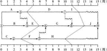 117、某工程双代号时标网络计划执行到第5周和第11周时,检查其实际进度前锋线如下图所示,由图可以得出的正确结论有()