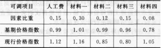 事件3:合同中约定,总造价根据人工费和四项主要材料价格指数,按调值公式法进行调整。各调值因素的比重、基准和现行价格指数如下表: