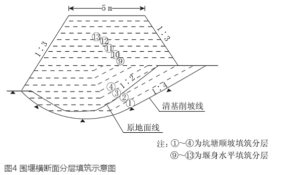事件2:排泥场围堰某部位围堰存在坑塘,施工单位进行了排水、清基、削坡后,再分层填筑施工,如图4所示。