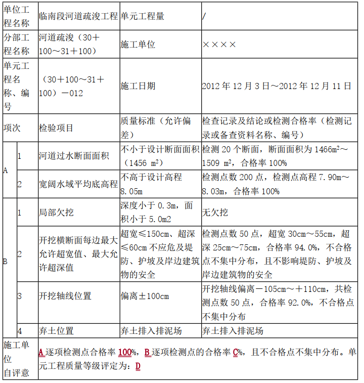 事件3:河道疏浚工程施工中,施工单位对某单元工程进行了质量评定,如表4所示。