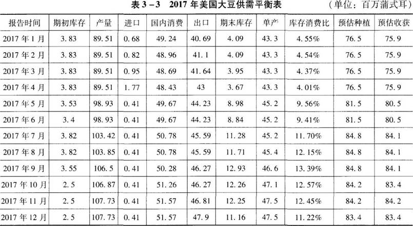 96、表3—3是美国农业部公布的美国国内大豆供需平衡表,有关大豆供求基本面的信息在供求平衡表中基本上都有所反映。