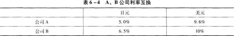 98、A公司希望以固定利率借入美元,B公司希望以固定利率借入日元。经即期汇率转换后,双方所需要的金额大体相等。经过税率调整后,两家公司可以得到的利率报价如表6—4所示。