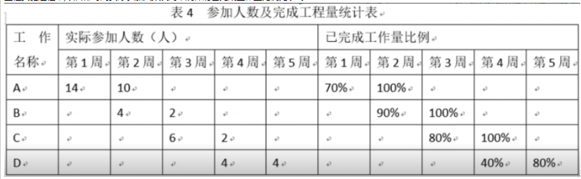 工程实施过程中,项目部每周实际参加人数及周末统计的已完成工作量比例见表4。