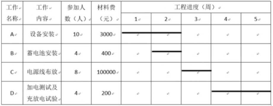 某地级市中心机房电源设备安装工程,工期5周(每周工作时间按7天计),项目部制订的进度计划见图4。