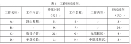 某大型施工单位承接了某运营商的一项管道光缆线路工程,工作内容和持续时间见表5。