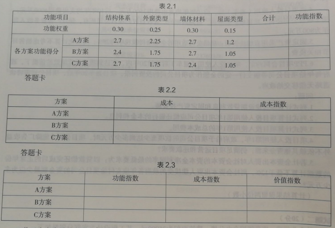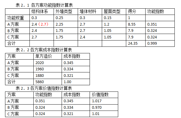 2.运用价值工程原理进行计算,将计算结果分别填入答题卡表2.1、2.2、2.3中,并选择最佳设计方案。