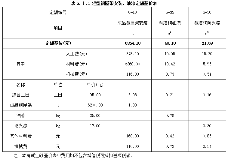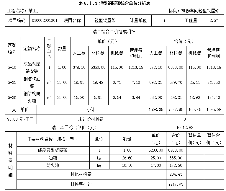 2.经测算轻型钢屋架表面涂刷工程量按35㎡/t计算;《房屋建筑与装饰工程工程量计算规范》(GB50854-2013)钢屋架的项目编码为010602001,企业管理费按人工、材料、机械费之和的10%计取,利润按人工、材料、机械费、企业管理费之和的7%计取。按《建设工程工程量清单计价规范》(GB50500-2013)的要求,结合轻型钢屋架消耗量定额基价表,列式计算每吨钢屋架油漆、防火漆的消耗量及费用,其他材料费用;并在答题卡表6.1.2“轻型钢屋架综合单价分析表”中编制轻型钢屋架综合单价分析表。