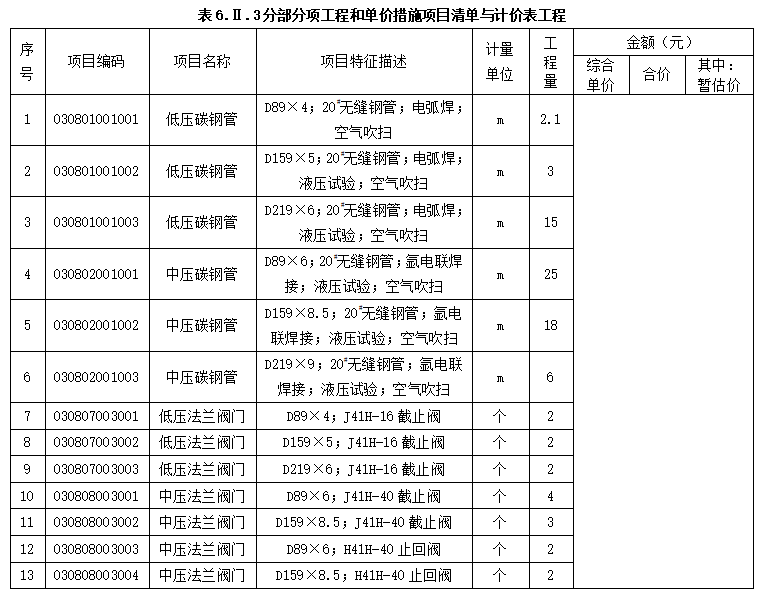 (2)假设成品油泵房的部分管道、阀门安装项目清单工程量如下:低压无缝钢管D89×42.1m;D159×53.0m;D219×615m。中压无缝钢管D89×625m;D159×8.518m;D219×96m。其他技术条件和要求与图6.2所示一致。