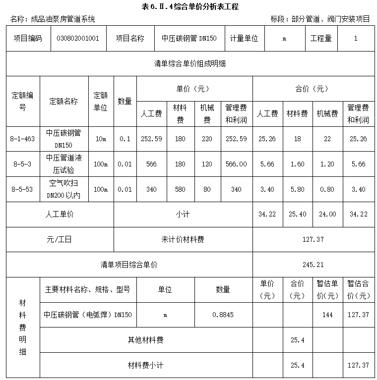 (5)假设承包商购买材料时增值税进项税率为17%、机械费增值税进项税率为15%(综合)、管理和利润增值税进项税率为5%(综合);当钢管由发包人采购时,中压管道DN150安装清单项目不含增值税可抵扣进项税额综合单价的人工费、材料费、机械费分别为38.00元、30.00元、25.00元。