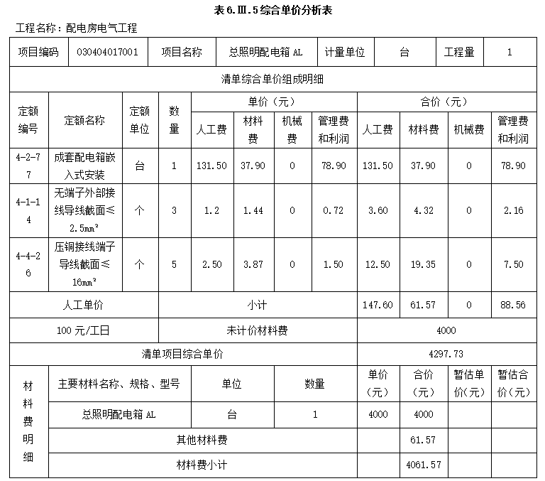 2.设定该工程“总照明配电箱AL”的清单工程量为1台,其余条件均不变,根据背景资料2中的相关数据,编制完成表6.3.5“综合单价分析表”。