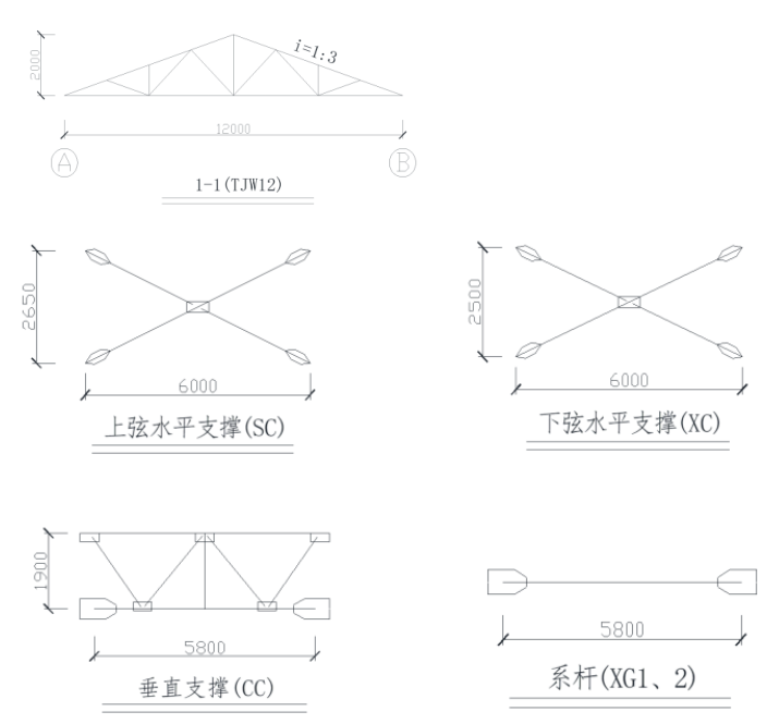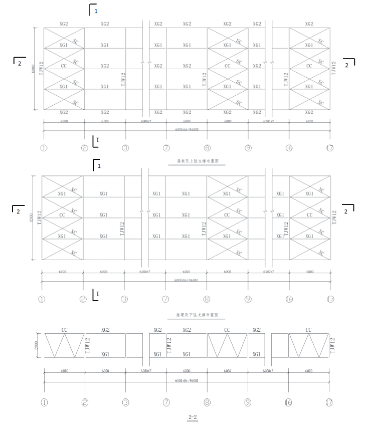 3.屋架上、下弦水平支撑及垂直支撑仅在①-②,⑧-⑨,⑯-⑰轴线的柱间屋架上布置。