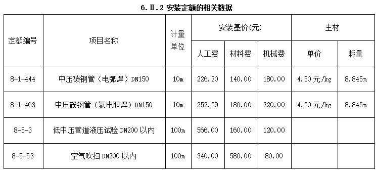 (4)管理费和利润分别按人工费的60%和40%计算,安装定额的相关数据资料见表6.2.2(表内费用均不包含增值税可抵扣进项税额)。