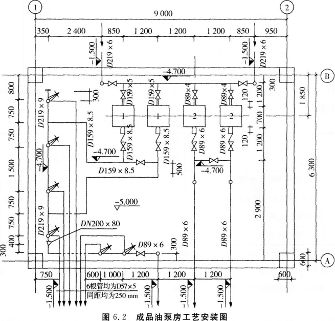 (1)成品油泵房管道系统施工图如图6.2所示。