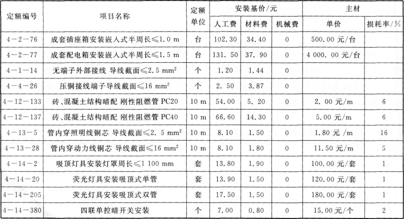 (2)该工程的相关定额、主材单价及损耗率见表6.3.1。