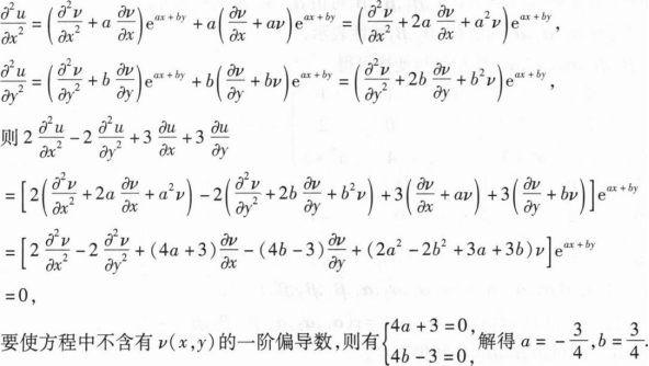,求a,b的值,使得在变换u(x,y)=v(x,y)eax+by之下,上述等式可化为函数v(x,y)的不含一阶偏导数的等式。
