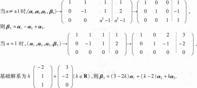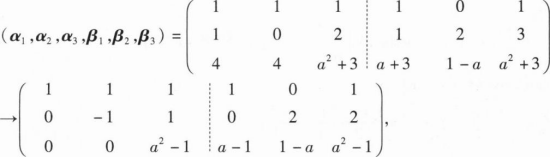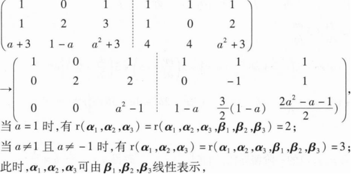 当a≠1且a≠-1时,有r(α1,α2,α3)=r(α1,α2,α3,β1,β2,β3)=3;