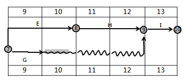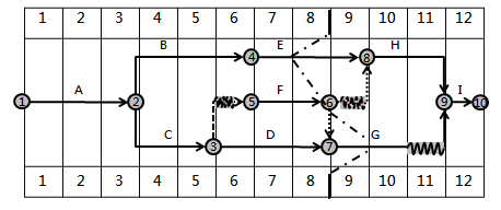 工序E延迟了1个月的时间,工序F与计划一致,工序G提前了1个月。从时标网络图中可以看出关键线路为A→B→E→H→I,E工作是关键工作,其直接影响紧后工程H的最早开始时间延迟1个月,影响总工期1个月;F工作对现场没有影响;G工作的提前均不影响其紧后工作的最早开始时间与总工期。