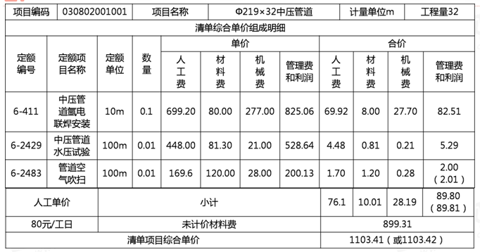 3.按照背景资料4中的相关定额,根据《通用安装工程工程量计算规范》(GB50856-2013)、《建设工程工程量清单计价规范》(GB50500-2013)规定,编制Φ219×32管道(单重147.50kg/m)安装分部分项工程量清单“综合单价分析表”,填入答题纸表6.Ⅱ.2中。(数量栏保留三位小数,其余保留两位小数)