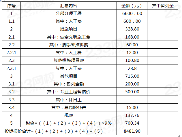 6.招标控制价合计=6600+328.8+715+137.76+700.34=8481.90(万元)
