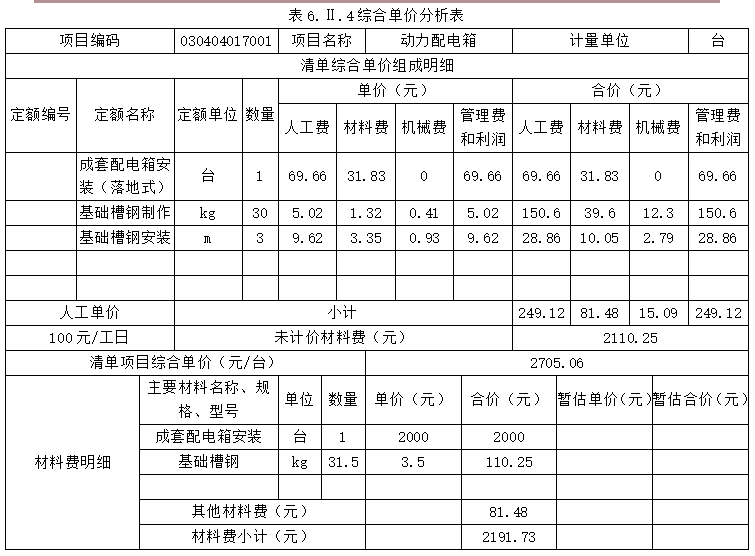 3.根据定额表,填写完成表6.Ⅱ.4配电箱“清单综合单价分析表”。