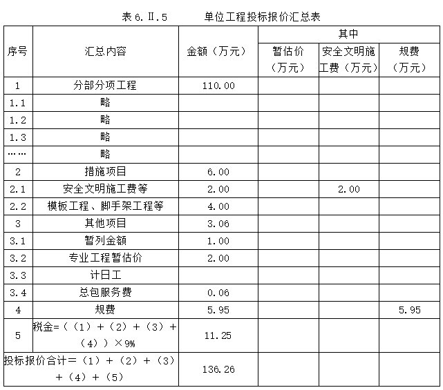 6.投标报价合计=110+6+3.06+5.95+11.25=136.26(万元)