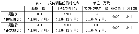 事件3:投标人A在通过资格预审后,对招标文件进行了详细分析,经初步测算,拟投标报价9000万元。为了不影响中标,又能在中标后取得较好的收益,造价工程师决定采用不平衡报价法对原估价作适当调整,调整前后数据详见表2-1。