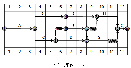 在施工组织设计中,施工进度计划以时标网络图(时间单位:月)形式表示,如图5。在第8个月末,施工单位对现场实际进度进行检查,检查结果如下:A、B、C、D、F五项工作已完成,E工作已完成1/3,G工作已完成50%。