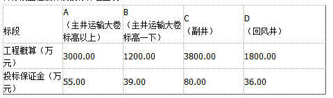 井筒设计完成后,该企业委托招标代理机构对矿井的三个立井井筒分4个标段进行施工招标,其中副井、回风井各为一个标段。主井由于位于运输水平以下装载硐室。其结构复杂,故决定以运输水平大巷标高为界分为上、下两个标段。四个标段分别交纳投标保证金,各标段工程概算及要求的投标保证金如下表所示。每家投标单位最多可选择2个标段投标。