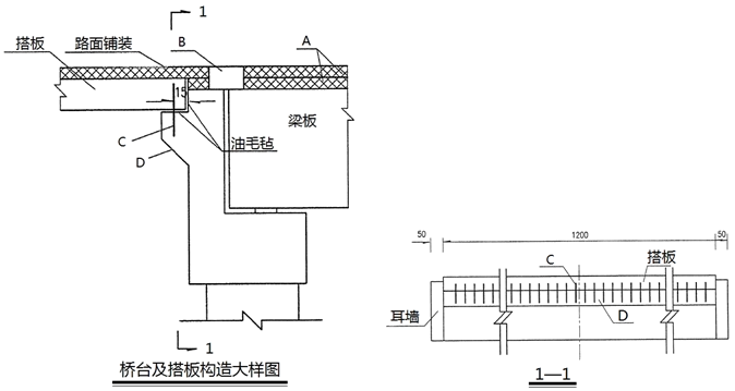 1.桥台及搭板大样图中A、B、C、D分别代表什么?并简述其各自的作用。