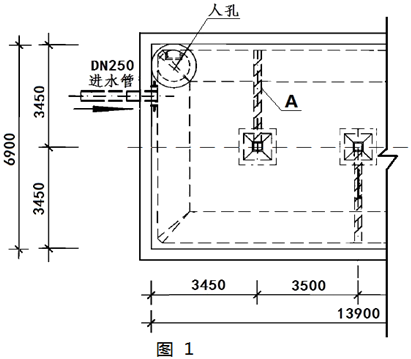 某北方城市供水厂因扩大再生产及工艺需求,需对该水厂进行改扩建,增设若干给水构筑物,通过招标程序,由一市政公司中标,工程包括沉淀池、过滤池、消毒池、输水管线等,其中一矩形有盖沉淀池,平面形式如图1所示: