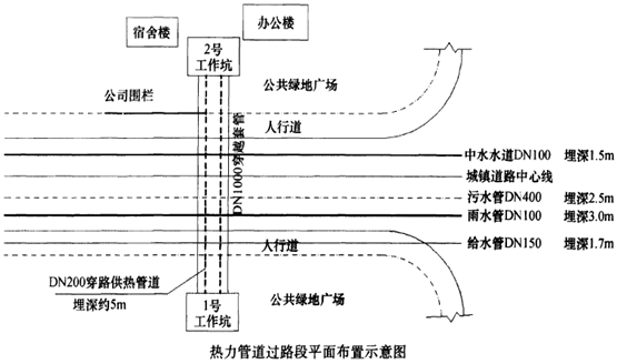 供热管线局部需穿越道路,道路下面敷设有多种管道。项目部拟在道路两侧各设置1个工作坑。采用人工挖土顶管施工,先顶入DN1000mm混凝土管作为过路穿越套管,并在套管内并排敷设2根DN200mm保温供热管道(保温后的管道外径为320mm),穿越道路工程所在区域的环境条件及地下管线平面布置如下图所示。地下水位高于套管管底0.2m。