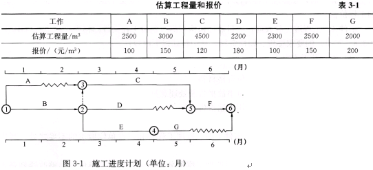 1、某工程,建设单位与施工单位按照《建设工程施工合同》(示范文本)签订了施工承包合同。合同约定:工期6个月;A、B工作所用的材料由建设单位采购;采用工程量清单计价规则的部分费用综合单价(风险费用忽略不计);施工期间若遇物价上涨,只对钢材、水泥和集料的价格进行调整,调整依据为工程造价管理部门公布的材料价格指数。招标文件中的工程量清单所列各项工作的估算工程量和施工单位的报价如表3—1所示,该工程的各项工作按最早开始时间安排,按月匀速施工,经总监理工程师批准的施工进度计划如图3—1所示。
