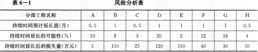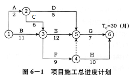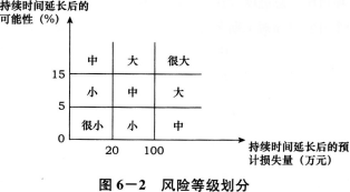 6、某工程,施工单位向项目监理机构提交了项目施工总进度计划(图6—1)和各分部工程的施工进度计划。项目监理机构建立了各分部工程的持续时间延长的风险等级划分图(图6--2)和风险分析表(表6—1),要求施工单位对风险等级在“大”和“很大”范围内的分部工程均要制定相应的风险预防措施。