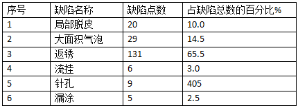 质检员检查底漆喷涂质量后发现,涂层存在大量的返锈、大面积气泡等质量缺陷,统计数据如下: